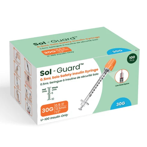 Sol-Guard Solo 0.5ml Safety Insulin Syringe w/ Fixed Needle, 30G x 1/2" / 800
