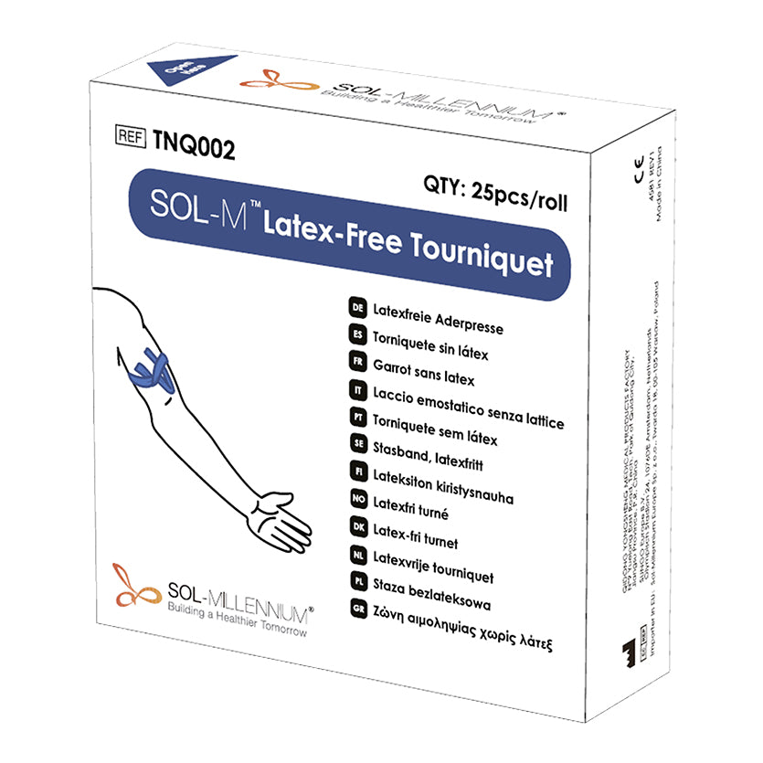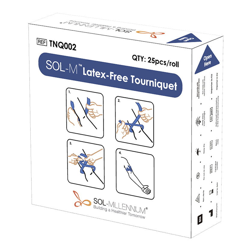 Precut, latex free elastic tourniquet strips are packaged in an easy dispensing box that is convenient to use and store.